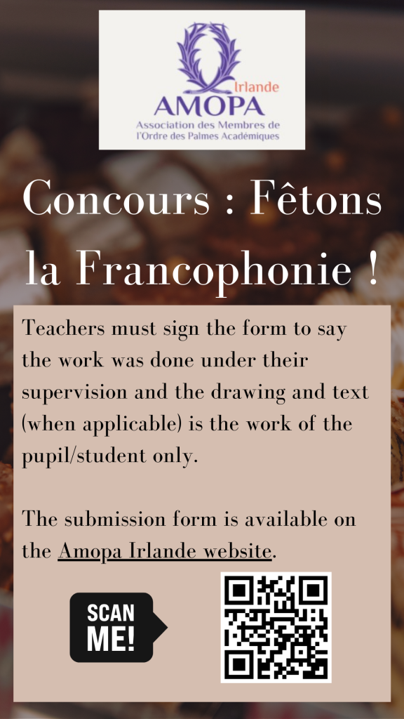 En ces temps difficiles, nous trouvons refuge de différentes façons. AMOPA Irlande publiera le 20 mars 2021, pour la Journée Internationale de la Francophonie, un recueil d’idées que les Amopaliens ont trouvées pour mieux apprivoiser ces temps difficiles. Nous aimerions que vous choisissiez un livre; un magazine; un programme radio; un podcast; une recette; une série; un film etc… francophone qui vous a aidé et que vous nous disiez pourquoi sous forme de texte, de vidéo ou d’audio. Les contributions peuvent être en français ou en anglais. Pour cela, merci de remplir le formulaire ci-dessous pour nous dire si vous voulez participer et nous dire ce que vous envisagez. Ce recueil sera publié sur le site Internet de l’AMOPA Irlande et sur le compte Twitter de l’AMOPA. Votre contribution est à envoyer avant le 10 mars à AmopaIrlandeCompetitions@gmail.com.